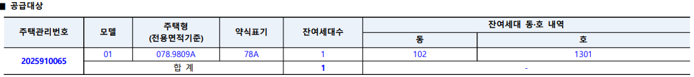 | 공급 세대 | 102동 1301호 78A (32평) - 사후접수 1세대 |