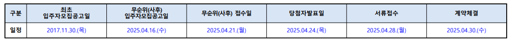 - 서류 제출 및 계약 체결: 당첨자는 2025년 4월 28일 (월)까지 서류 제출을 완료해야 합니다. 계약 체결은 2025년 4월 30일 (수)부터 시작됩니다.