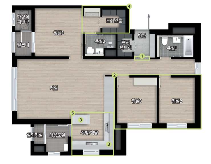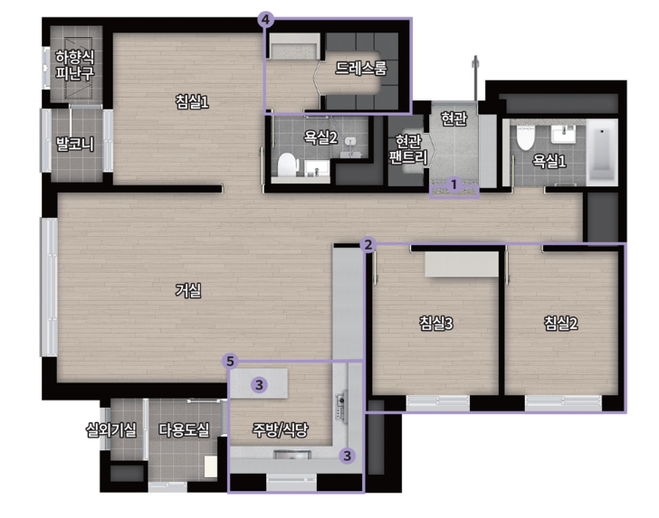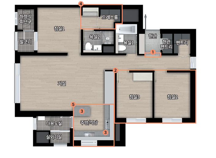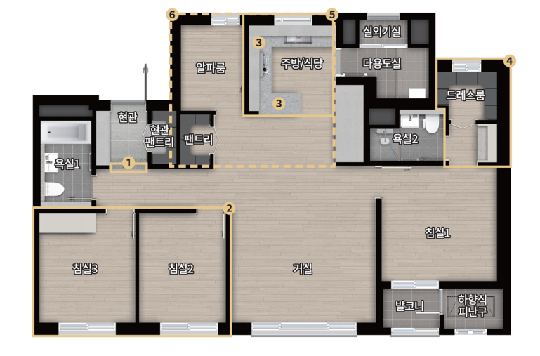 - 수납 특화: 드레스룸, 펜트리, 알파룸