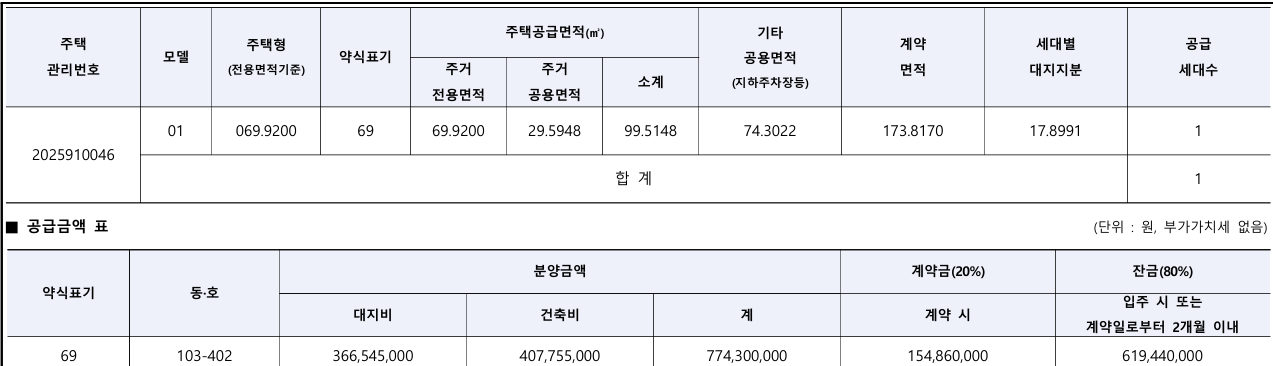 | 전용 69 ㎡ | 전국민(유주택자 가능) | 약 7.7억 원 | 약 1.5억 원 | 103동 402호 | 없음 |