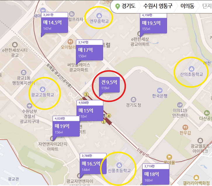 - 신풍 초등학교,연무 중학교,광교 고등학교가 단지 근처에 있어 아파트에서 학교까지 5분 이내 거리로, 자녀를 둔 가구에 매우 유리한 조건