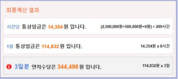 하루 8시간 근무를 기준으로 계산하면, 1일 통상임금은 약 114,832원이 됩니다. - 연차수당 계산: 114,832원 × 3일 = 34만 4,496원